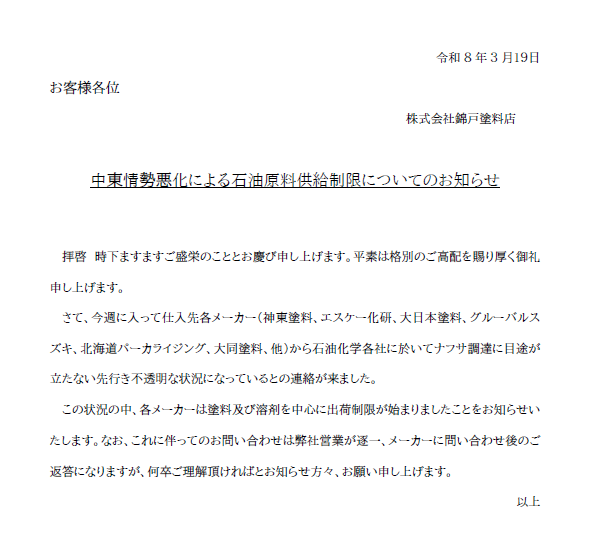 中東情勢悪化による石油原料供給制限についてのお知らせ