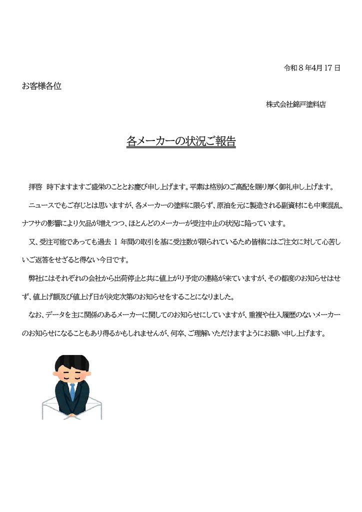 各メーカーの状況ご報告